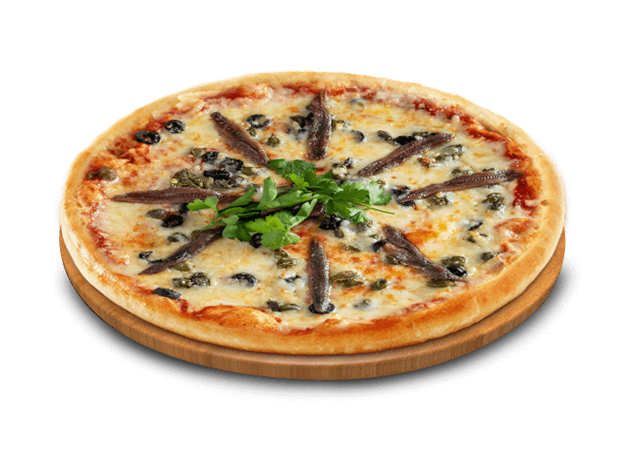 Tomate, fromage, cocktail de fruits de mer, crème fraîche, olives, origan.